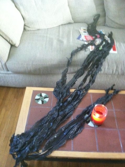 Taking the second trash bag, cut or tear it (I often can’t find my scissors) down either side until you reach the bottom seam. This will give you a long, roughly rectangular sheet of plastic. Tear or cut 8, 1-inch-wide strips off of the sheet, making the strips as long as you can.The width and length don’t need to be laser accurate, but you want the strips wide enough they won’t tear in the wind if you mount the spider outside. The longer the better, since these legs will be what really makes the spider look spider-y.