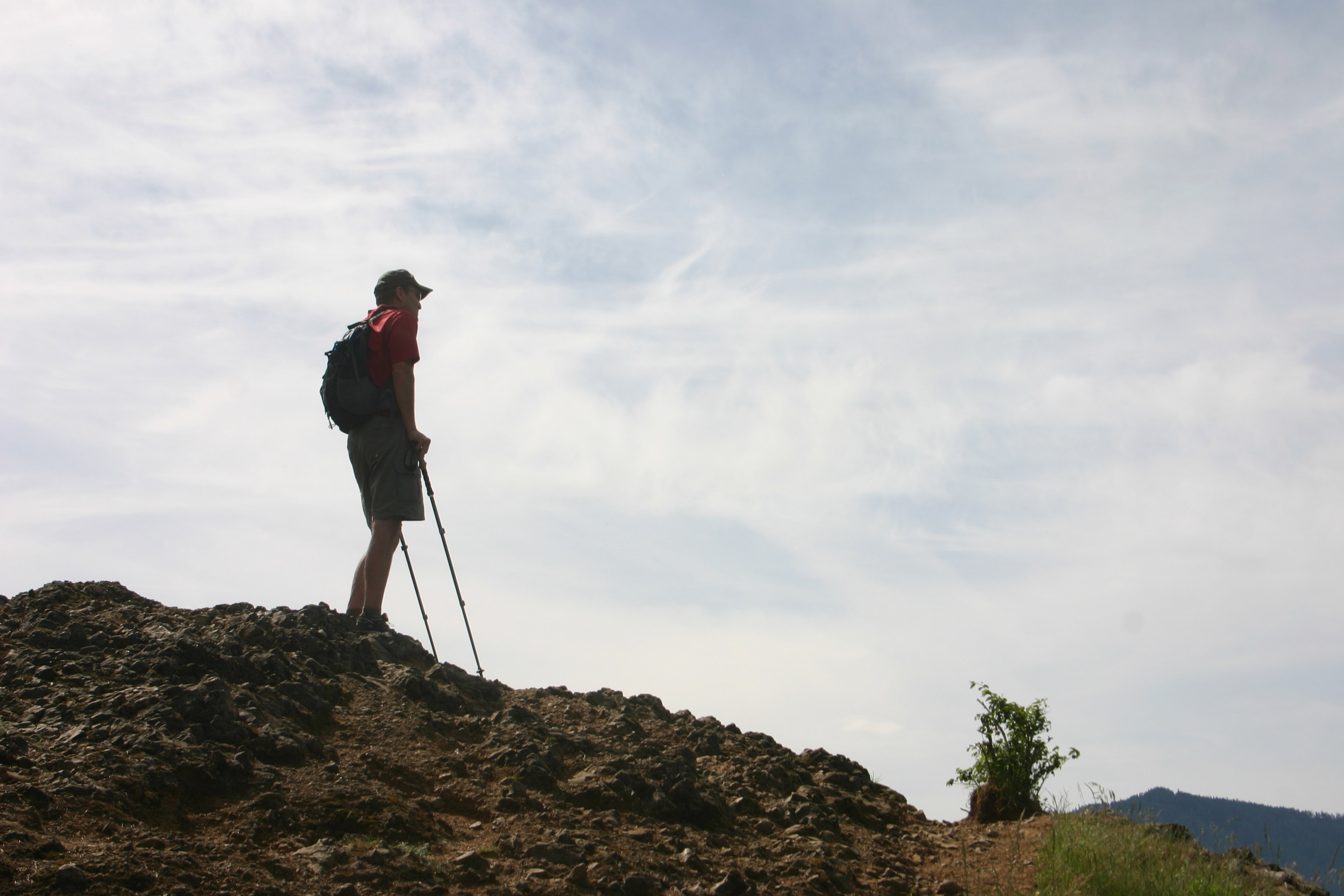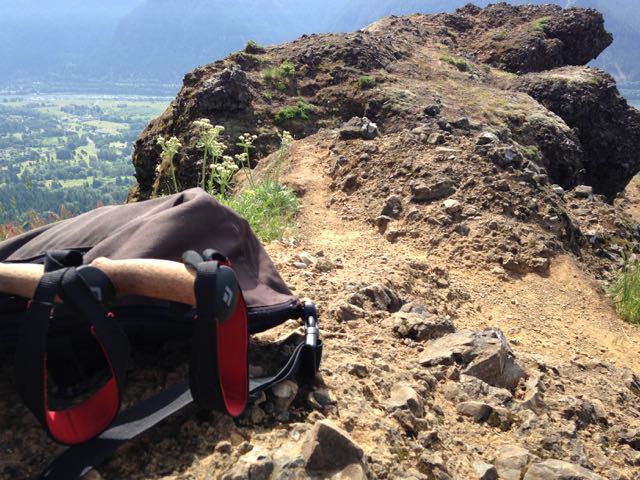 The standard: two Black Diamond walking sticks, a liter of water, a couple of ridiculously heavy cameras, a pullover fer if it got cold at elevation (it did not), a compass, a trash bag, a multi-tool, and, of course, a corkscrew (even though this was a flask hike and not a wine-bottle hike).