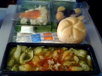 But if you’re anywhere else on the plane, then right after the steward puts your pasta platter on the fold-down tray in front of you, you have to figure out how to eat the bloomin’ stuff.
